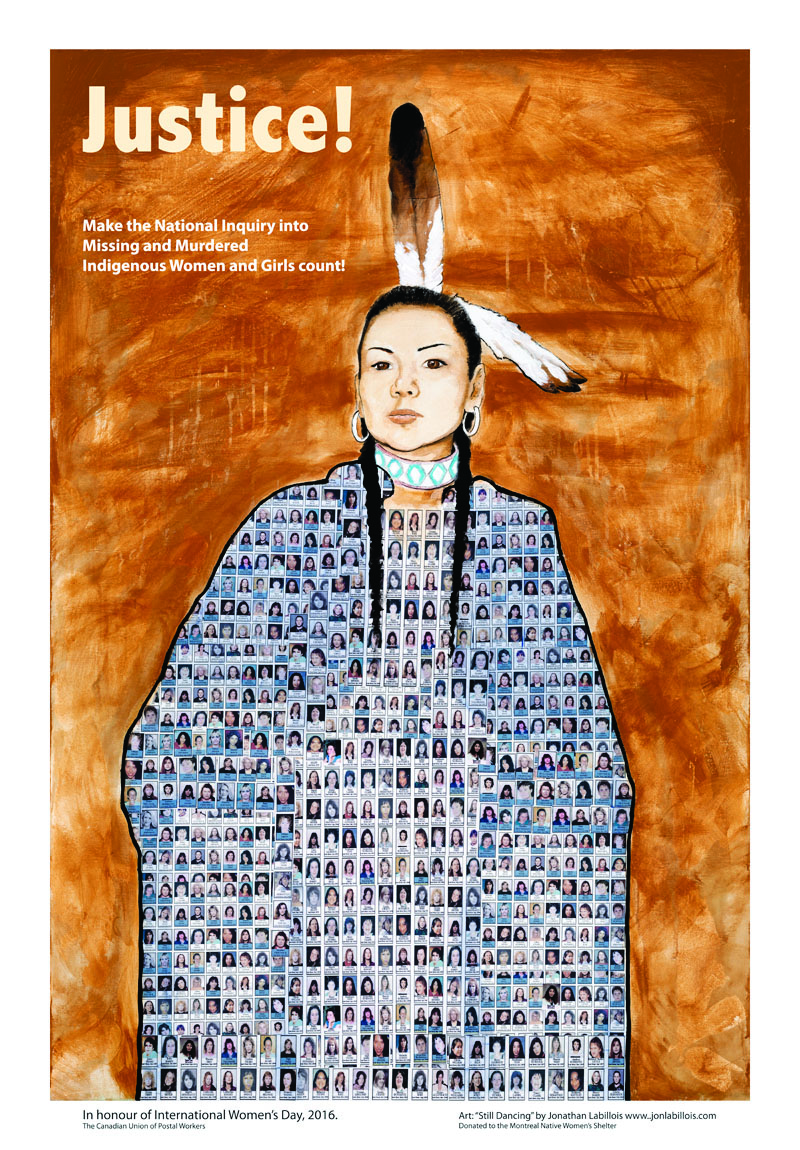 The art on the poster is the work of Indigenous artist Jonathan Labillois, A Member of the Listuguj Migmaq First Nation Band in Gaspé, Quebec. He has donated the original to the Native Women’s Shelter of Montreal. He posted the image on his Facebook page with the following comment: “Dancers dance for those who cannot, the sick, the elders, and those who are gone. It's like all those women are still dancing thru her.”